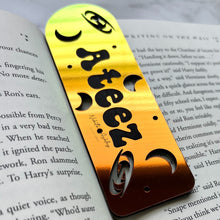 This Ateez inspired bookmark comes in a color shifting acrylic - orange to yellow to green - with black details and can be customized to feature the name of your choice.
