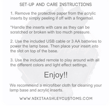 **Acrylic inserts will arrive to you with a protective paper backing that can be easily peeled off by hand or with duct tape - simply cut a piece of duct tape, smooth it over the surface of the insert with slight pressure and peel it away, repeat until you've removed all of the paper. To clean we recommend using a microfiber cloth.